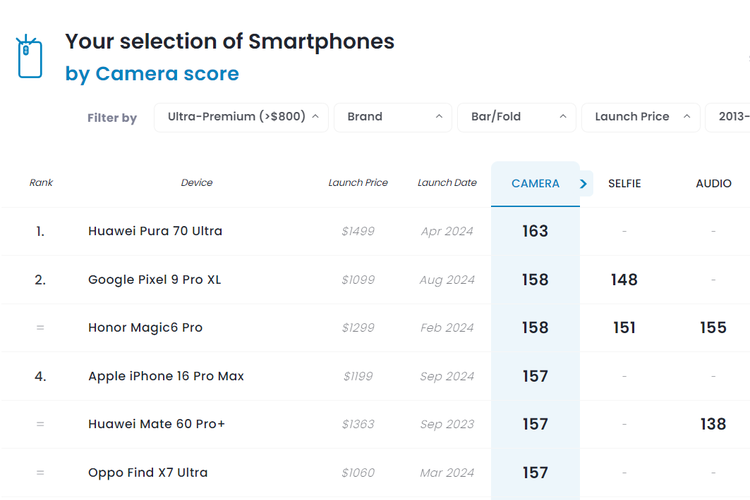 iPhone 16 Pro Max harus mengakui keunggulan Huawei Pura 70 Ultra (163 poin), Google Pixel 9 Pro XL (158 poin), dan Honor Magic 6 Pro (158 poin).