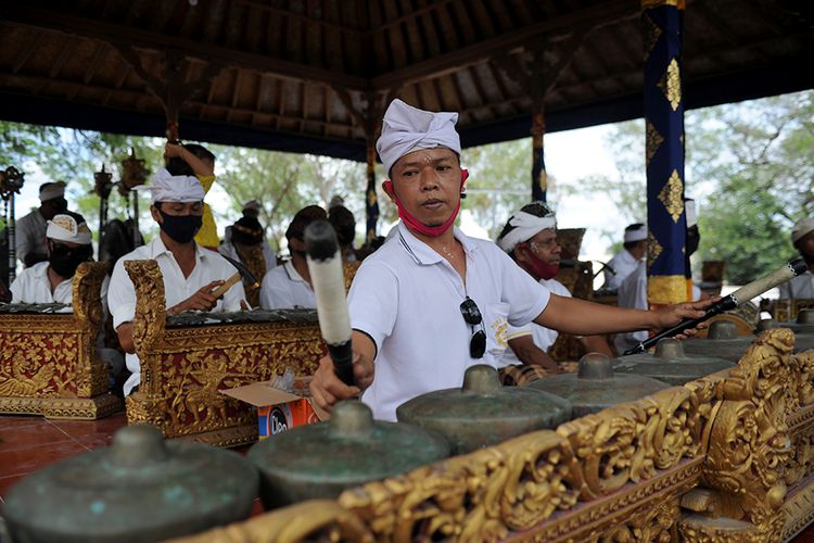 AFP/SONNY TUMBELAKA Warga memainkan alat musik saat perayaan Hari Raya Kuningan di Pura Sakenan di Pulau Serangan, Bali, Sabtu (26/9/2020). Hari Raya Kuningan yang digelar beberapa hari setelah Galungan ini dimaksudkan untuk merayakan saat Dewa-dewa dan leluhur kembali ke surga setelah bertemu keturunannya.Pada Hari Raya Kuningan esok hari, diyakini bahwa para dewa dan leluhur akan turun ke bumi, tapi hanya sampai tengah hari saja sebelum akhirnya kembali ke surga.