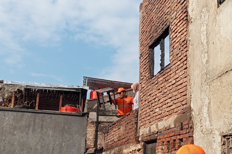 Seorang anggota PPSU terlihat membereskan barang-barang yang terdampak kebakaran di lantai dua rumah yang masih selamat. Dia pun membuang puing-puing ke lokasi kebakaran agar lebih mudah diangkut yang lain.