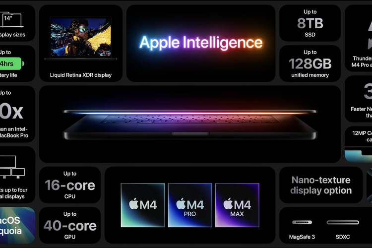 Apple merilis lini MacBook Pro baru yang kini ditenagai trio chipset anyar, yakni M4, M4 Pro, dan M4 Max. Ketiganya juga didukung Apple Intelligence Halaman all [1,366] url asal