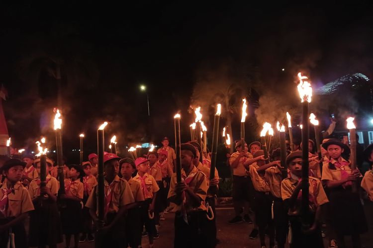 KOMPAS.com/SHINTA DWI AYU Siswa SD dan SMP di Kecamatan Kobalima Timur, Kabupaten Malaka, Nusa Tenggara Timur, menggelar pawai obor, Jumat (16/8/2024) malam. Pawai obor digelar sebagai momen menyambut peringatan ke-79 kemerdekaan Republik Indonesia.Kepala Sekolah SMPN Metamauk, Robert mengatakan, muridnya sudah berada di PLBN Motamasin sejak pukul 16.00 WITA untuk melaksanakan pawai obor.