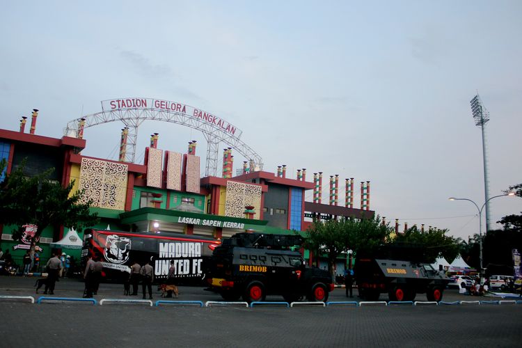 KOMPAS.COM/SUCI RAHAYU Suasana depan pintu utama jelang leg kedua Championship Series Liga 1 2023-2024 antara Madura United vs Persib Bandung di Stadion Gelora Bangkalan, Jumat (31/5/2024) sore.Pekan ke-3
