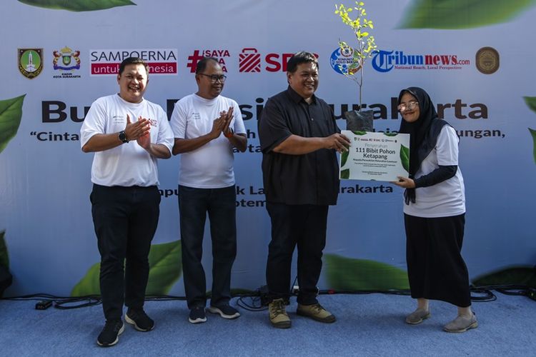 YOMA Vovo Susatio (kedua dari kanan) menyerahkan bibit pohon ketapang kepada perwakilan warga Laweyan di acara Bulan Bersih Surakarta, Laweyan, Sabtu (7/9/2024). Pada acara dengan tajuk Bulan Bersih Surakarta.Salah satu peserta dari SRC, Budi Susilowati (58), mengaku senang bisa ikut terlibat dalam kegiatan bersih-bersih di Kampung Batik Laweyan.
